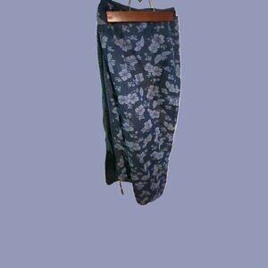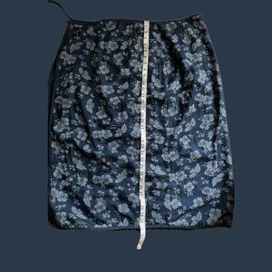 This medium indigo skirt offers two looks in one! The exterior features a true blue denim, perfect for casual day wear. The reverse side reveals a charming hibiscus floral print