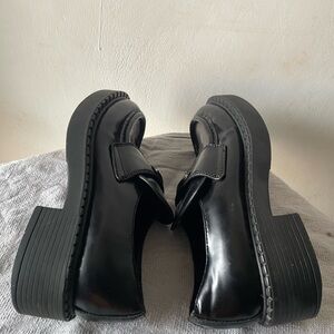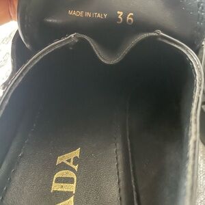 The loafers feature a chunky lug sole and the iconic Prada enamel triangle logo on the strap. They are made from brushed leather. The shoes are a hybrid design, blending a classic loafer silhouette with modern elements. Very comfortable, Sleek black leather loafers. Features signature Prada emblem. Perfect for versatile styling. Still looking new, worn once for less than an hour, size was the issue. I wear 6.5, this is a size 6. It’s beautiful though.