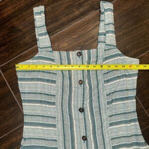 Effortlessly coastal and cool, this Roxy striped button-front mini dress is perfect for summer days or beach getaways. Made from soft breathable cotton in shades of aqua, teal, and white with vertical stripe patterns that flatter the figure. Features wide straps, coconut-style buttons down the front, two side pockets, and a relaxed A-line silhouette.