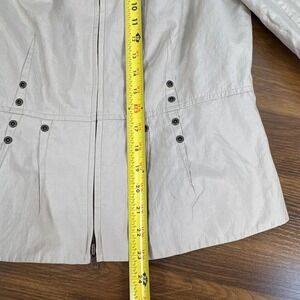 Keywords: Anthracite by Muse, Beige jacket, Leopard print lining, Moto jacket, Zip front jacket, Women's jacket, Designer jacket, Fashion jacket, Peplum hem, Studded details, Stylish outerwear, Chic fashion, Animal print accent, Size 4 jacket
