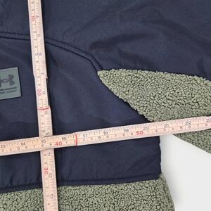 The EUC Under Armour Mission Boucle Swacket in Green Black is a stylish and versatile jacket designed for men. Made of polyester with a boucle fabric type, this mid-length jacket features a solid pattern and long sleeves, perfect for various occasions including travel, casual outings, formal events, workwear, and business meetings. The jacket includes zipped pockets and a full zip closure, making it both functional and fashionable. With a size small and a regular fit, this Under Armour jacket is a great addition to any wardrobe for the winter, fall, and spring seasons.