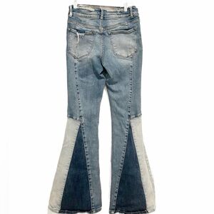 Step out in style with these trendy Vervet two-tone flare jeans. Perfect for adding a touch of flair to your casual look. Distressed detailing. Size 27. Inseam approximately 31” and rise approximately 10”.