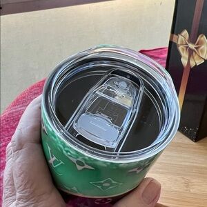 Elegant fashion tumbler with Louis Vuitton monogram. Features emerald and black design. Ideal for stylish hydration.