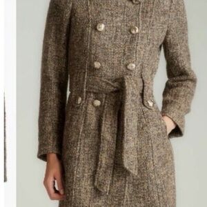 Calvin Klein brown tweed trench coat. Double-breasted design with belted waist and decorative gold buttons.
