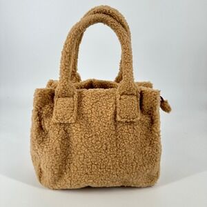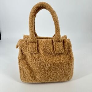 J. Crew Small Sherpa Teddy Bear Fur Tote Bag Camel Tan Top Handle Zipper Closure