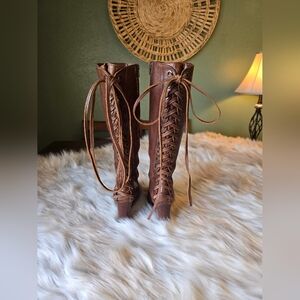Apepazza's super sexy back lace leather wedge boots! The vaunted Italian boot maker created a masterpiece on these boots! Soft brown kidskin leather that still fills your closet with a rich alluring aroma. Apepazza's legendary 4 inch heel and their amazing rubber all weather sole make these rare specimens of the boot world your perfect go to asset for every fall and winter adventure! Lovingly cared for and moisturized, these boots are in excellent condition!