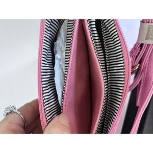 Elevate your style with this NWT DELUXITY pink crossbody purse. This compact bag is perfect for women who love to accessorize. The exterior is made of faux leather and features a striped black and white lining. The crossbody strap is also made of faux leather, making it comfortable to wear for extended periods. This purse is perfect for any occasion, whether you're running errands or going out for a night on the town. The compact size allows you to easily carry your essentials without weighing you down. The Deluxity brand is known for its quality and this purse is no exception. Add it to your collection today!