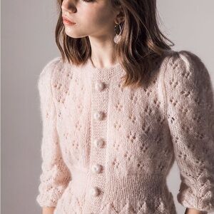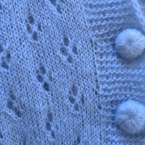 This gorgeous hand-knit Fiona Maridruna cardigan is a pale baby blue, is made of soft mohair, with peplum detail and covered knit buttons.