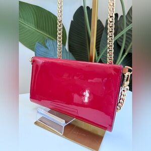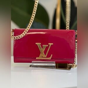 Gorgeous deep red rose patent leather Louise wallet by Louis Vuitton. Large LV gold tone hardware at the front and center. Wallet opens to 12 card slots, 4 interior open pockets, 1 zippered coin compartment and 2 slip pockets under the flap.