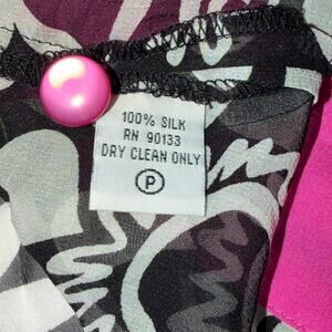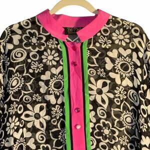 Bold and artistic Bob Mackie Wearable Art sheer silk top featuring a graphic floral print in black, ivory, and gray with vibrant hot pink and green contrast trim. This statement piece has a lightweight, flowy silhouette with front button closure and long sleeves. Perfect as a layering jacket over a tank or dress for a dramatic, artful look.