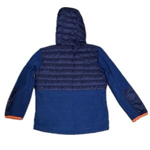 Cozy boys Hybrid Jacket, down vest center with thinner sleeves for lighter cold days by Free Country. Size 7/8 or S, new with tags. Features vibrant blue and orange design. Ideal for cool weather.