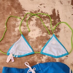 Victoria's Secret Pink. Team Pink Set. Bikini Top is New With Tags. Shorts are in like new conditiin no stains,rips, or cracking in perfect condion. Front closure on shorts is velcro with front tie. See photos for measurements.