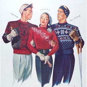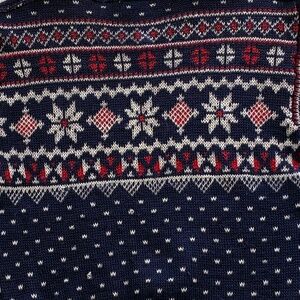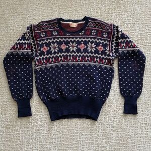 Beautifully detailed Jantzen snowflake Scandinavian inspired 1940s vintage ski sweater. The wool is thick, soft and flexible. Natural vintage wear and in good vintage condition with several areas where threads are loosening and wearing with age, most noticeably on right elbow area. Most can be easily repaired. All in all good for its age and can certainly be worn as is. Likely originally for men, but can be unisex in sizing. Sizing probably M/42. Measures 20” pit to pit. 24” long, 23” sleeve. Ribbing at waist and sleeves is very stretchable.