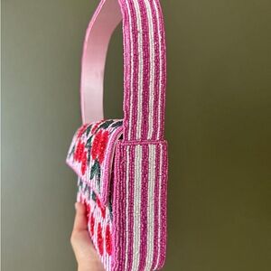Stylish and vibrant, this pink and red beaded bag is perfect for adding a pop of color to any outfit. The intricate beadwork showcases a playful design, making it a standout accessory for any occasion.