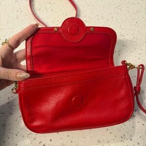 Chic crossbody bag in vibrant red. Features signature logo detail. Ideal for everyday use.