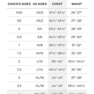 Chico’s size 2 is a standard size large. See size chart pictured.