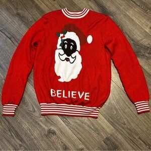 Bright red sweater with Santa face and 'Believe' text. Ideal for holiday festivities.
