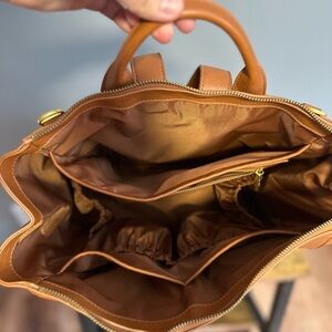 Square diaper bag includes changing pad, changing clutch, paci case & stroller hooks. Good condition, some wear on hardware from use. Few marks on front of backpack as shown in pictures. Very stylish!