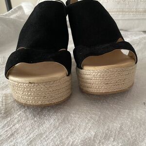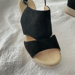 Stylish black espadrille wedges by Cordani. Features a comfortable platform and adjustable strap.