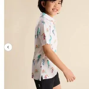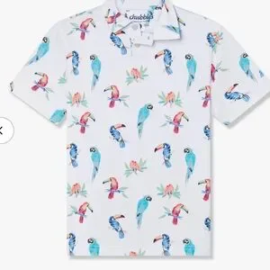 Fun parrot print on a white polo. Bright and playful design. Ideal for casual wear.