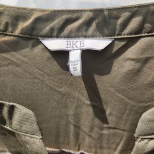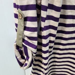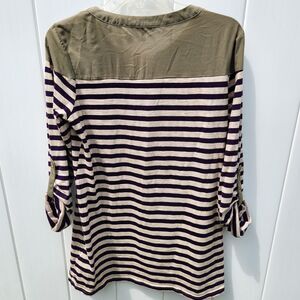 Elevate your wardrobe with this stylish BKE Striped Henley Top in size Small. The V-neckline and roll tab sleeves add a touch of sophistication to this lightweight tunic blouse. The striped pattern in shades of green, blue, and cream creates a trendy look that is perfect for any casual or formal occasion.