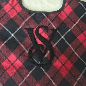 Red, black and white plaid print. Raised, black VS logo on the front. Inner, cell phone sized side pocket. Snap closure.