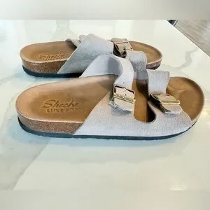 Stylish Skechers Granola slide sandals with dual buckles and straps. Luxe Foam sole for comfort.