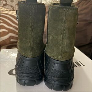 Stylish shearling-lined boot winter boots with olive suede upper and black durable rubber sole. Perfect for cold weather as they are comfortable and waterproof and also provide weather protection and traction.