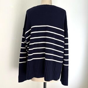 Gap, 24/7 Split-Hem Crewneck Sweater, New With Tags, 100% Cotton Navy & White Stripes, Size L. Soft cotton knit, dropped shoulders, long sleeves with ribbed banded cuffs, ribbed crewneck, side slits and a ribbed banded hem.