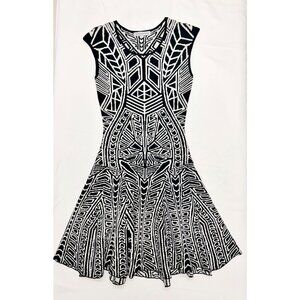 Bold, sculpting, and effortlessly striking, this Hera Collection fit & flare dress channels Art Deco glamour with modern, body-flattering structure. The intricate black and ivory geometric knit creates a visually sculpted silhouette, contouring through the bodice before flaring into a playful, feminine skirt that moves beautifully with every step.
