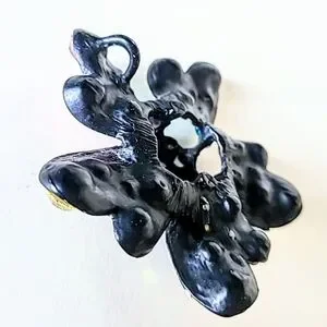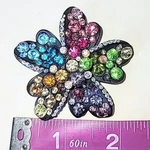 Amazing five-petalled flower pendant with so many different colors of rhinestones set into a black matte japanned mounting.
