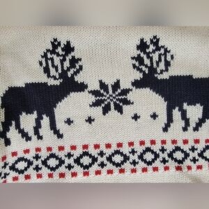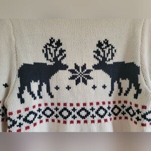 Design: Features a jacquard-knit Nordic-inspired pattern, with two prominent reindeer and a snowflake design on the front. It has a turtleneck/polo neck, long sleeves, and ribbed cuffs and hem.