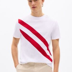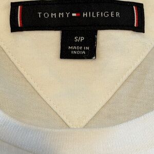 Classic Tommy Hilfiger white T-shirt with small logo on chest & 2 large angular red stripes. This design is no longer available in stores.