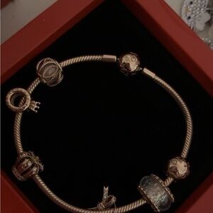 This elegant rose gold plated Pandora charm bracelet. It is perfect for adding a touch of sophistication to any outfit. The intricate design and shimmering color make it a standout piece in any jewelry collection. Comes with authentic charms seen in picture