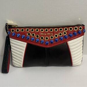 Miu Miu Nappa Biker Cry Vintage Rare red blue and white Studded Quilted Clutch✨