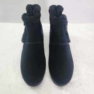 Cozy black boots with blue accents. Ideal for winter wear. Soft lining for warmth.
