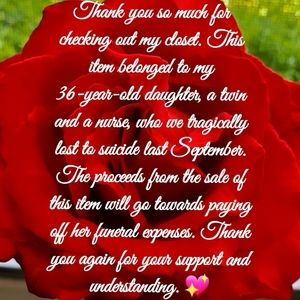 This tote belonged to my 36 year old daughter who we recently lost to suicide. Proceeds to go towards paying for her funeral service. Thanks so much for your support. 💖
