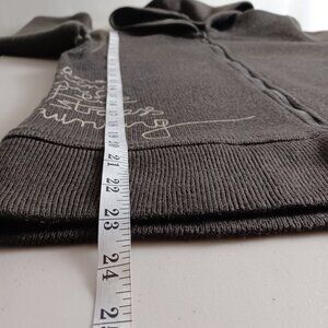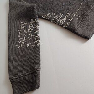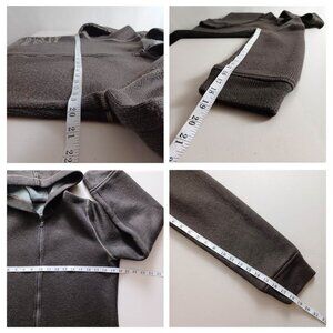 A warm hoodie in brown with contrast stitching and handwritten-script overlays. Rib-knit shell with tech knit lining; moderate stretch. Ideal for fall layering, winter casuals, and cool spring mornings. Gently worn, great condition with minor piling.