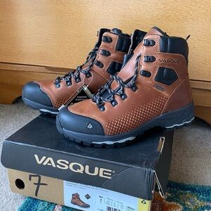 Experience the great outdoors with Vasque's durable brown and black boots, featuring a rugged design perfect for trail adventures. These boots offer excellent ankle support and protection with their high-top construction and reinforced toe caps. Crafted from premium leather, they ensure long-lasting wear and comfort on any terrain. NWT, men’s size 7 woman’s size 9.