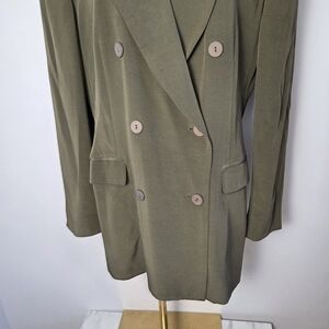 Stylish green silk blazer with a double-breasted design. Features classic lapels and button details.