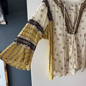 Chic boho blouse with floral patterns. Cream and yellow hues. Perfect for casual wear.