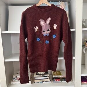 Stay cozy and cute with this Zara Harry Lambert Intarsia Bunny Sweater! This unique design combines comfort and whimsical style, making it a standout piece for your wardrobe. Perfect for casual wear, layering, or adding a playful touch to your outfit. Soft, warm wool knit fabric for ultimate comfort. Relaxed fit for effortless styling. Deep burgundy color for a chic, seasonal look. Size small. Great preloved condition