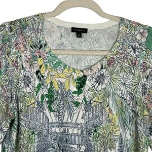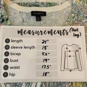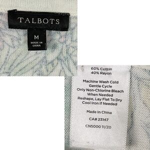 Talbots Med · button front cardigan · 3/4 sleeve · botanical garden print · lightweight knit · 60% cotton 40% rayon · machine wash cold gentle cycle lay flat to dry