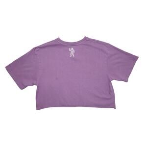 Super cute purple cropped tee by Billionaire Boys Club. Features a vibrant rainbow watercolor-style logo and astronaut graphic on the front, with astronaut detail on the back. 100% cotton, soft and breathable.