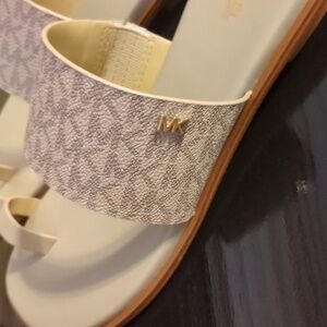 Step out in style with these elegant Michael Kors slide sandals. Featuring a chic beige color, these sandals are perfect for any casual outing. Enjoy comfort and fashion with every step.