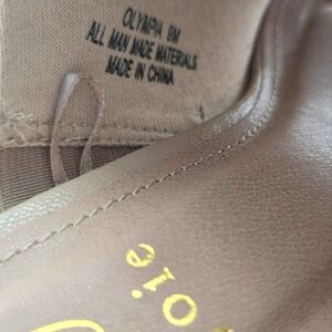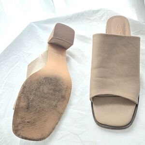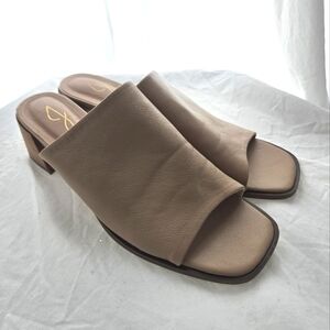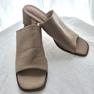 Lovely stone colored slides with genuine leather look material and wood look block heels. Heels 2 inches with a square toe. Elastic built into the shoes for a more flexible step. Comfortable, classy, and they can match a wide variety of outfits. Order them today.