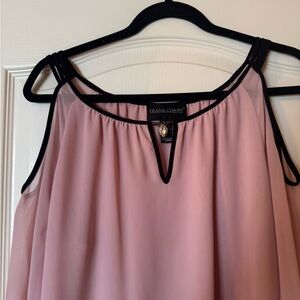 Elegant Frank Lyman Design chiffon cold shoulder blouse in a soft blush pink with striking black contrast trim. This top features a flattering V-notch neckline accented with an attached crystal-style pendant necklace, adding instant polish with no extra styling required.