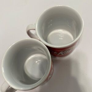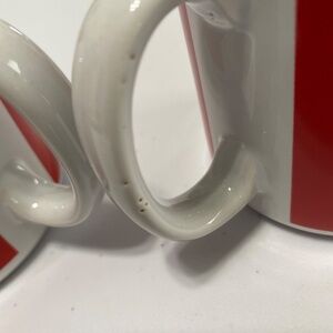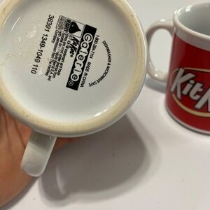 Kit Kat coffee cups 2 of them red and white nice coffee cups one of the handles has some tiny like holes in them but still very nice cups :) 4” tall 3 1/2” wide