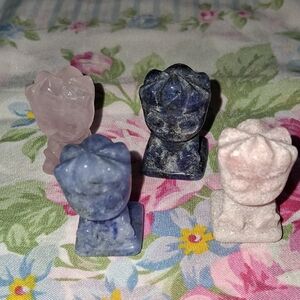 Beautiful set of four stone grout carved figurines. Includes shades of pink opal, Rosequartz, blue sodalite and blue aventurine. Perfect for decoration or collection.approximately 1x1.5 inches