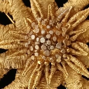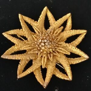 This bold goldtone sunflower brooch is perfect for adding a touch of sophistication to any outfit. Good condition, some signs of wear.
